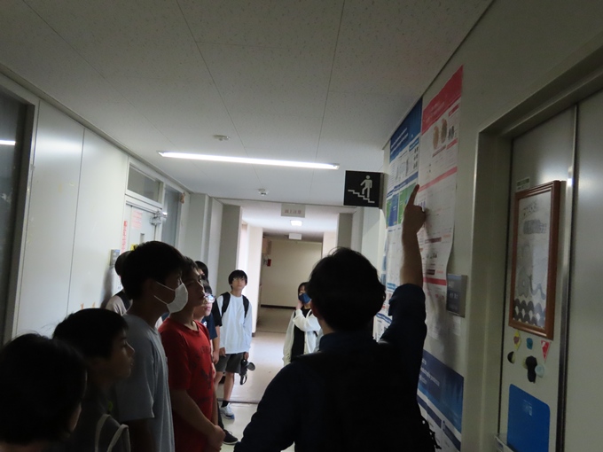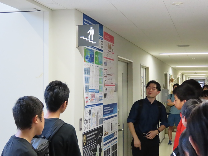 12月上旬の「成果発表会」に向けて、ポスター発表の流れや作成時のポイントを解説する講座を開講しました。講座の後半では、自然科学分野のポスターの作りについて、地質科学プログラム教員の研究室前に掲示されているポスターの実物を見学することで、「成果発表会」におけるポスター発表のイメージを膨らませました。