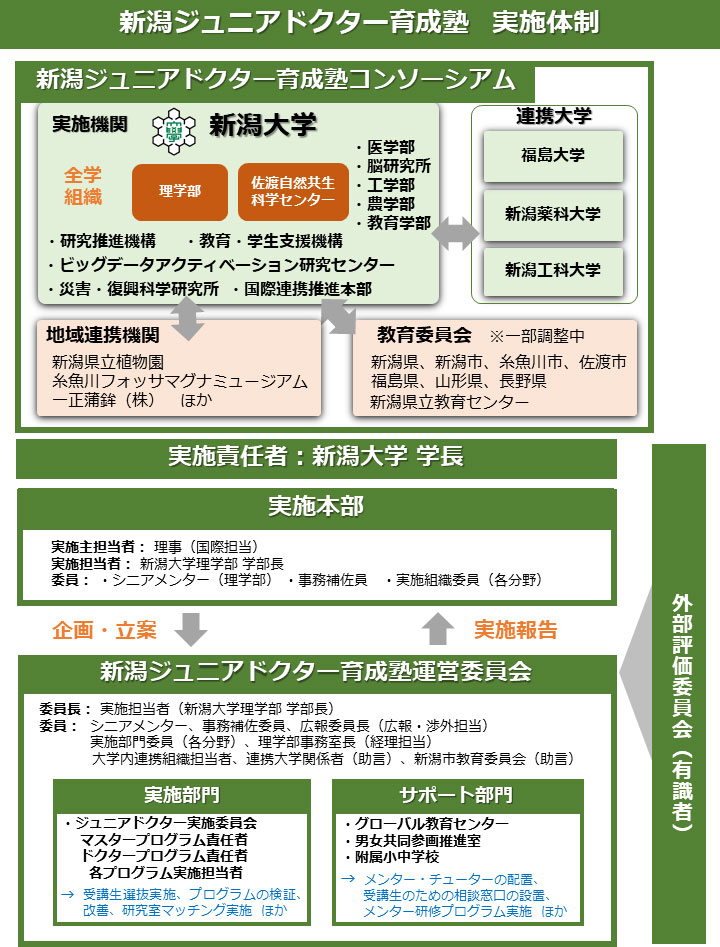 新潟ジュニアドクター育成塾は、国立研究開発法人科学技術振興機構の次世代人材育成事業の平成31年度採択事業としてスタートしました。本事業は、小中学生を対象に、子供たちの科学の芽を育てることを目指すもので、新潟県の豊かな自然を舞台にして、本学の特色ある研究分野や留学生を活用して、自然・生物・人に関するさまざまな課題についての能動的学習の場を子供たちに提供するものです。1年目の昨年は、予定していた佐渡合宿が台風の影響で中止せざるを得ず、また今年は新型コロナウイルスの感染拡大による集会の制限があり、当初予定していたプログラムが実施できないということはありますが、オンラインを含め、可能な範囲でさまざまな意欲的な試みを進めたいと思います。子供たちがワクワクし、未来のサイエンティストを目指したくなる育成塾を目指しますので、皆様のご協力を改めてよろしくお願い申し上げます。