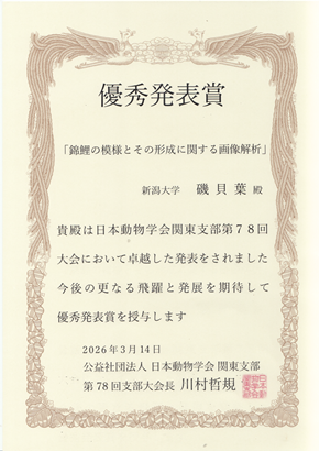 - 日本動物学会関東支部第78回大会 優秀発表賞